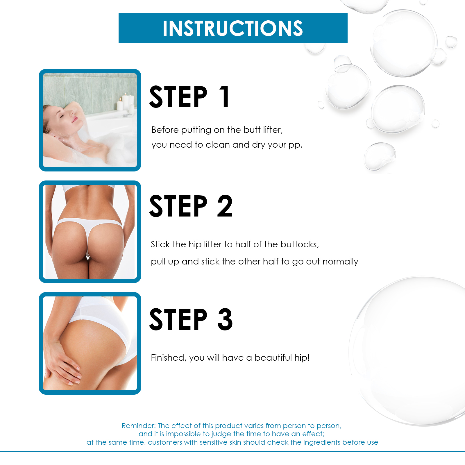 我们的提臀贴含有甘草根提取物,山茶花提取物。它可以滋养臀部肌肤,强化紧致度,使臀部富有弹性、丰满、性感。它的使用方法很简单:步骤 1:在佩戴提臀带之前,您需要清洁并擦干您的臀部。步骤 2:将提臀带粘在臀部的一半,向上拉起并粘上另一半,即可正常穿出。步骤 3:完成,您将拥有美丽的臀部。并且可以拥有性感的臀部,可以大胆地穿着而不用担心别人的眼光。