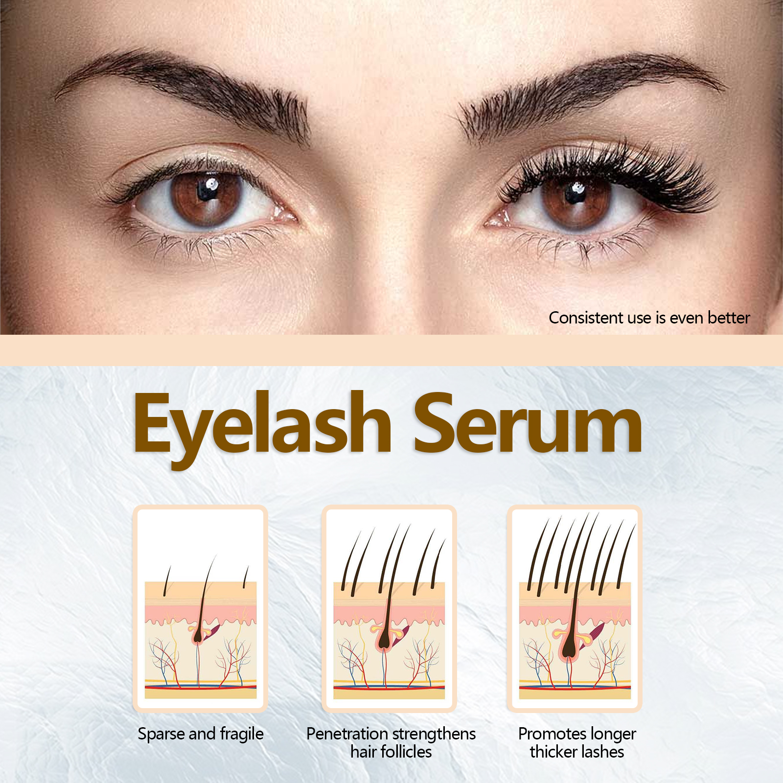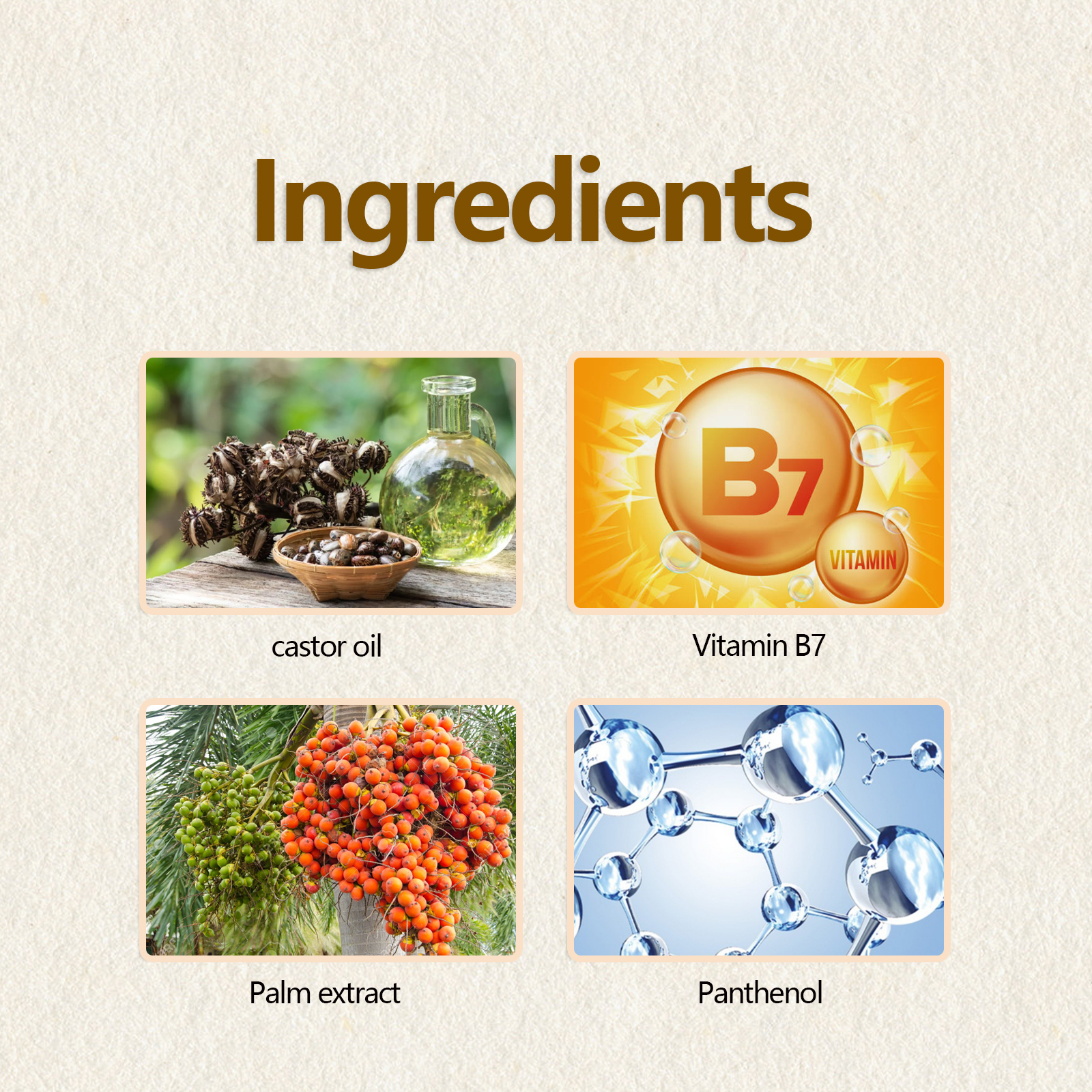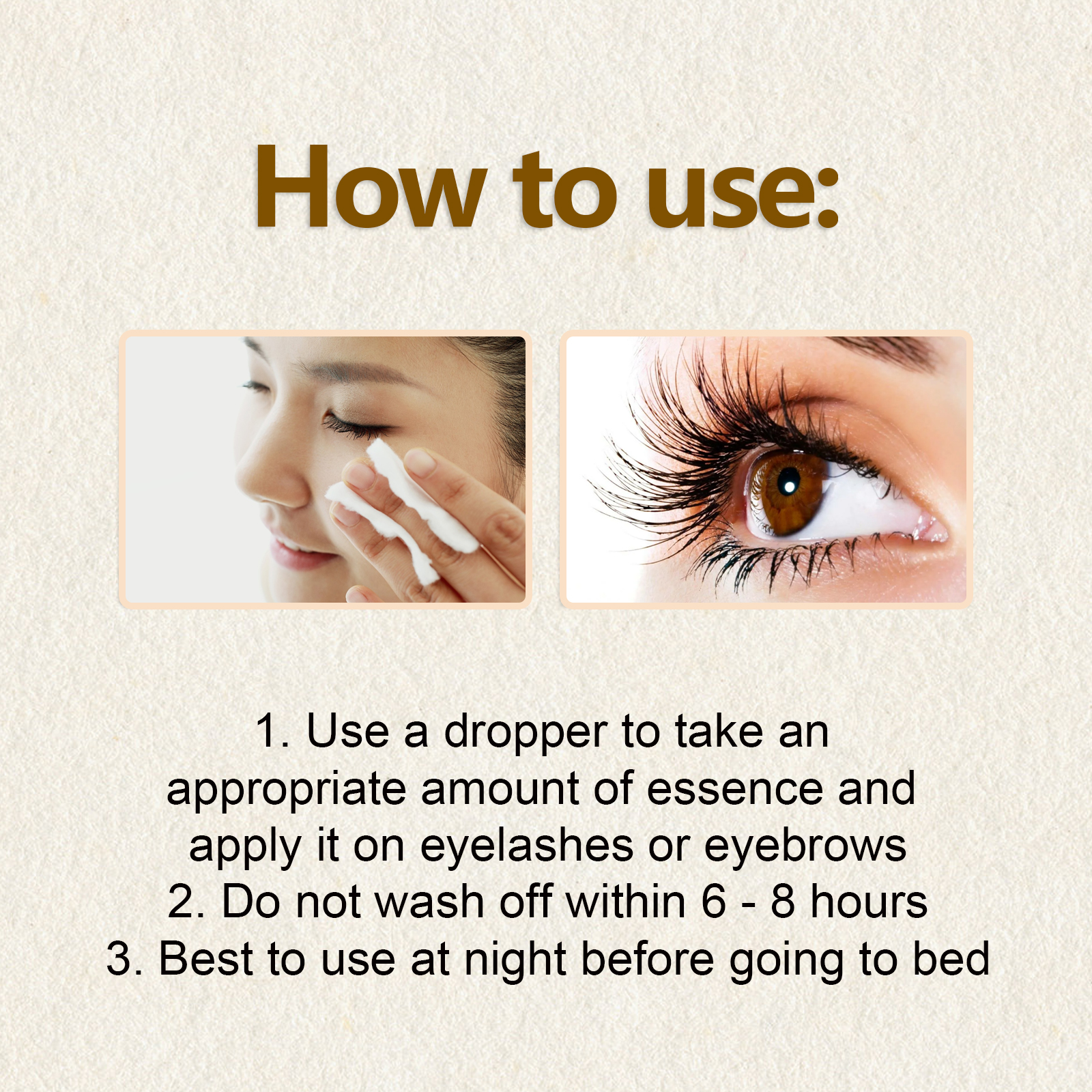 我们的睫毛液含有蓖麻油、维生素B7、棕榈提取物。它可以促进睫毛生长速度,有效帮助睫毛长得更健康、更长、更浓密;滋养毛囊,促进新发生长,使睫毛光滑有光泽,使眼睛自然迷人。它的使用方法很简单:1. 用滴管取适量精华液涂抹在睫毛或眉毛上;2. 6 - 8小时内不洗掉;3. 最好在晚上睡觉前使用。睫毛精华液让你的睫毛焕然一新的,得到应有的呵护!它提供了一种全面的方法来恢复你的睫毛,让你的睫毛看起来更饱满、更茂盛。让你的眼睛充满魅力和美丽!