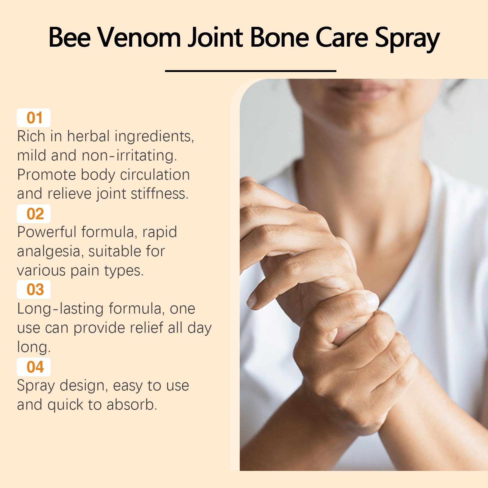 我们的蜂毒关节护理喷雾,由甘油、蜂毒精心调配而成。专为迅速缓解关节疼痛设计。使用方法极为便捷:彻底清洁肌肤并使其干燥,取本品适量,均匀喷于腕、肩、肘、颈、背、膝等关节及骨痛部位,等待它干燥和吸收。并且可以适合所有肌肤类型,温和无刺激。